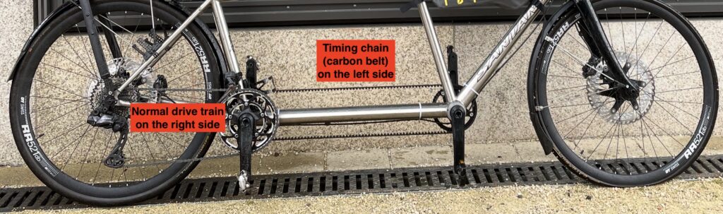 - Cadence: Marco’s drivetrain is connected to mine via a long belt called the timing chain. This means our pedals are locked in sync and we always share the same cadence. That includes when we are grinding up a hill and when one of us is tired and starts grinding the large chainring. Two people, one bicycle, one cadence.