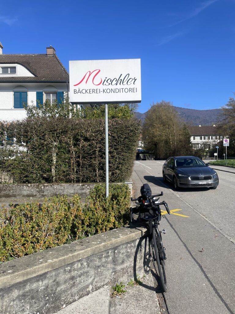 We stopped at a bakery in Selzach around 64 km (40 mi) into the ride. Buying food is always entertaining. We walk in visibly hungry and order enough for a small group. The looks we get are priceless. The sandwiches were excellent, as fresh bakery bread almost always is.