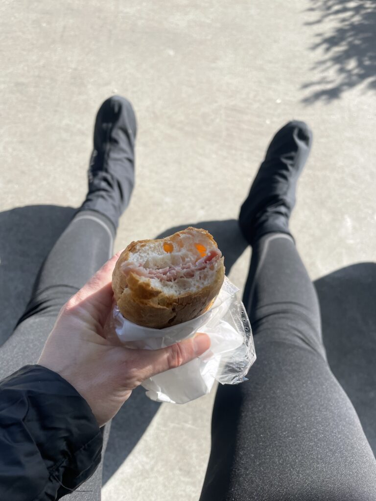 We found a COOP, bought water, and sat on a small wall near a boulangerie. No indoor seating. The wall was cold enough to qualify as experimental cryotherapy with questionable consent. We ate an éclair and a cheese pie that was not heated, which paired beautifully with the rapidly progressing numbness of my entire posterior. By the end, I had achieved a level of numbness usually reserved for minor surgical procedures. At that point, I was no longer sure if I was resting or being medically preserved for later use.