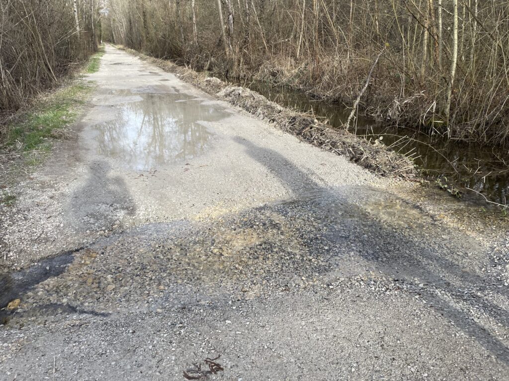 Due to my rushed planning, we encountered several sections of loose gravel mixed with mud, puddles, and even a small river crossing. The rear of the tandem slid unpredictably, but Marco kept us upright. My wrists and shoulders took a beating, and I was thoroughly cooked by the end of it.