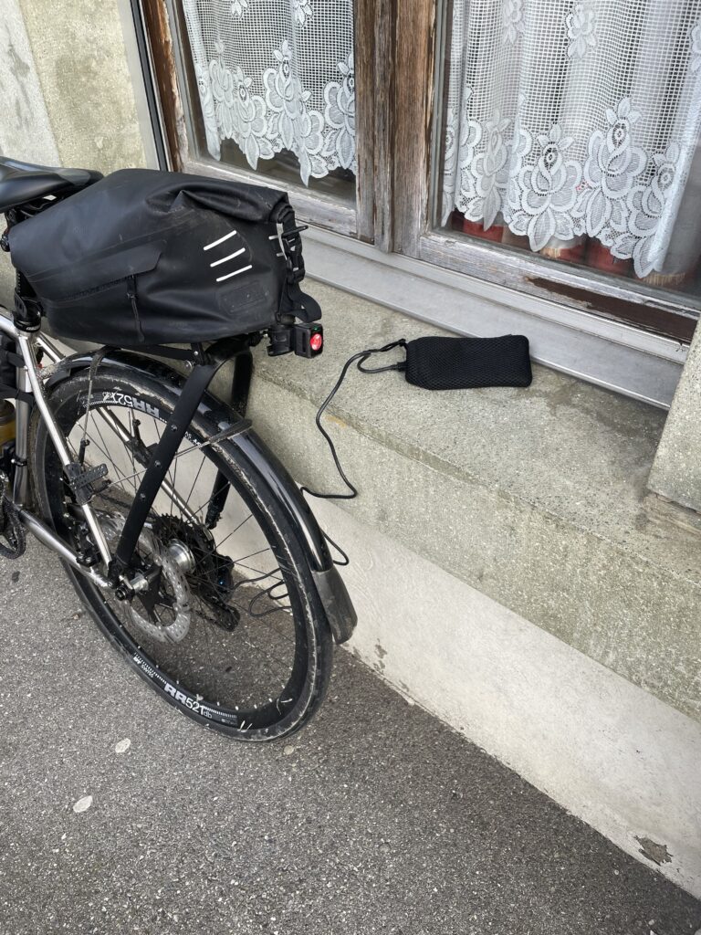 The hotel was right on the route. Despite advertised bike parking, construction had removed any racks. We locked the tandem to a bench and activated the Knog alarm, outsourcing security to hope. The Di2 was charged using the Ravemen PR2000 front light, which doubles as a 10,000 mAh power bank.