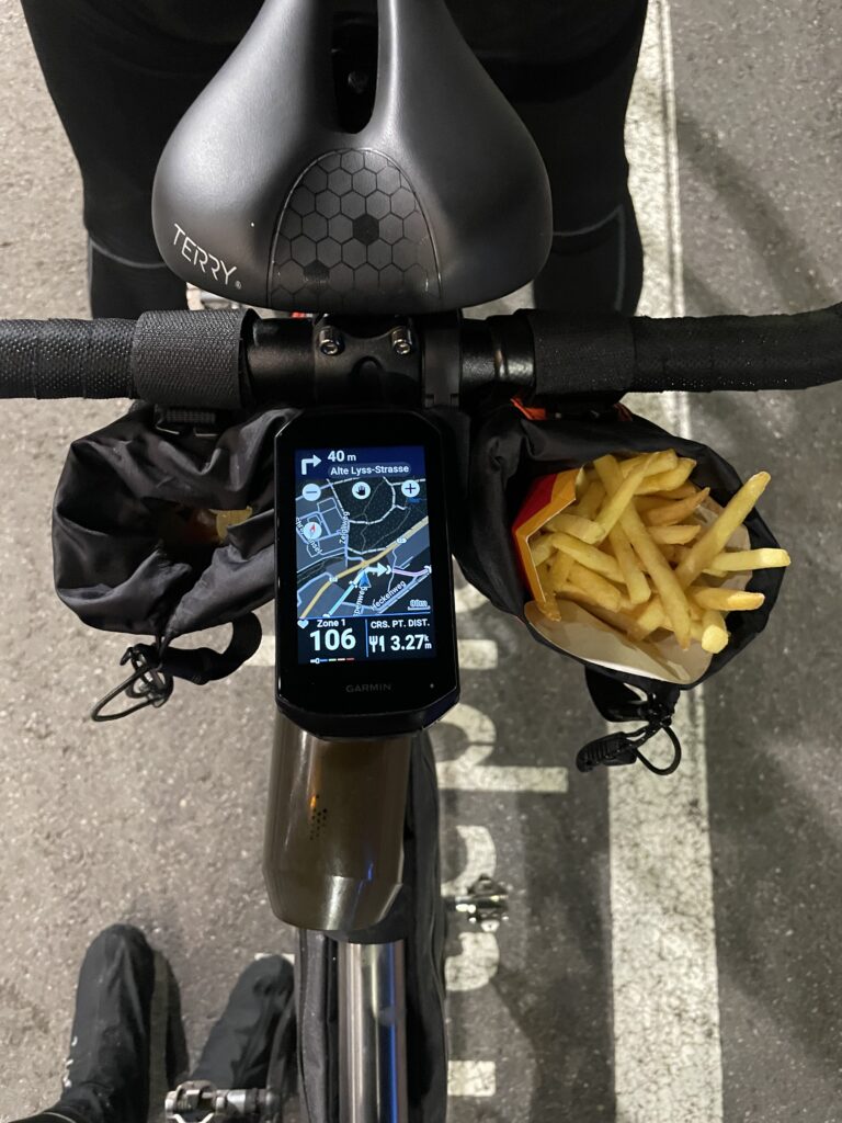 At around 220 km (137 mi), we attempted again to find dinner. A pasta restaurant appeared like a hallucination. We parked, went inside, and were turned away. Fully booked. No food. In the end we found a McDonalds. Fast food saved us. I bought fries, fully intending to combine them with wine gums in my feedbag. Fueled by ultra processed optimism, we pushed the final 40 km (25 mi) to the hotel.