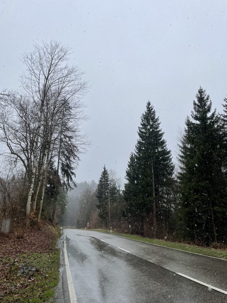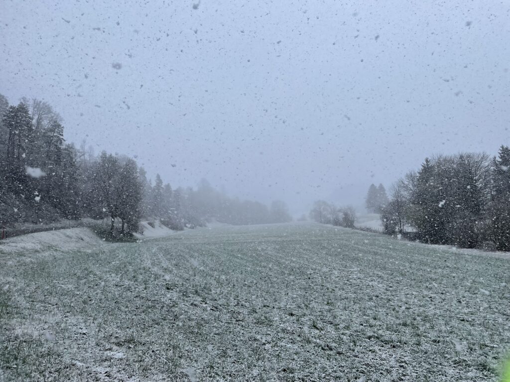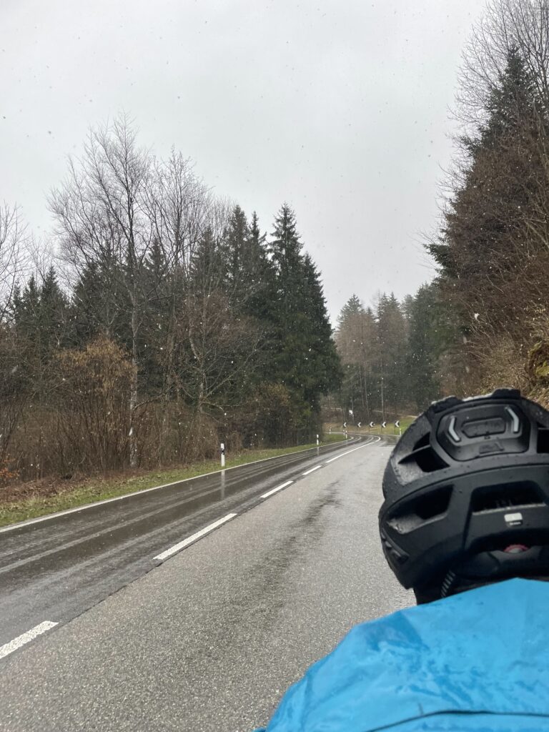 After hitting every climb possible within a 100 km (62 mi) radius, we finally reached Balsthal and started the 7.6 km (4.7 mi) climb back over the mountain. About 1.5 km (0.9 mi) in, I thought I saw snow. We were unsure. Ten minutes later, we were no longer unsure.
