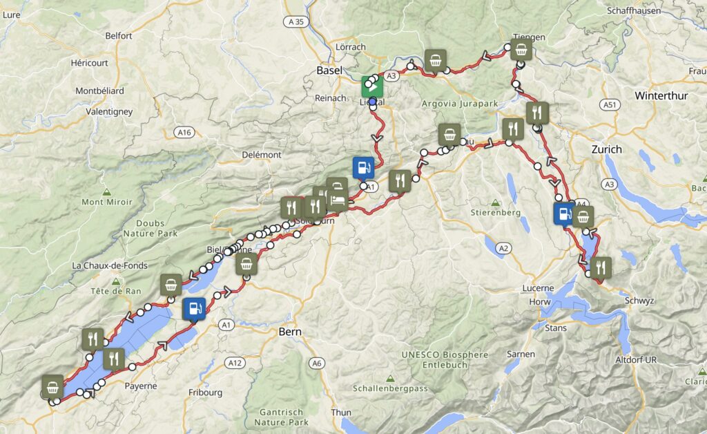 The plan was ridiculously simple. Climb over the Brunnersberg via Balsthal, turn west, ride past the Bielersee, loop around Lac de Neuchâtel, then return via Solothurn. Our hotel would be at 260 km (162 mi) in Deitingen at the “good bed” hotel in Deitingen. The next day we planned to ride past Aarau, loop around the Zugersee, continue to Waldshut, and return home via the Rhine towards Basel, bringing the total to about 510 km (317 mi).