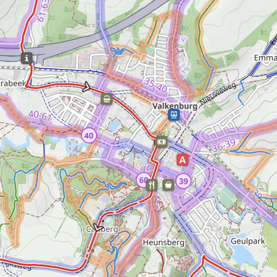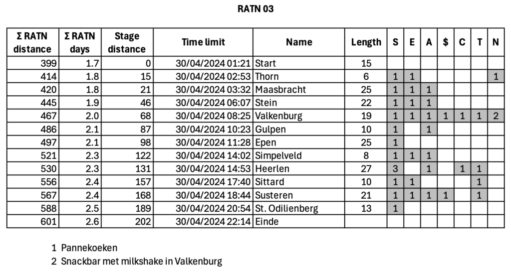 In order to not be overwhelmed by waypoints on my eTrex during the ride, I put a waypoint before the town listing all facilities available. So For example: N2SEA$CT Valkenburg means in Valkenburg I need to read Note 2, supermarket, a place to eat quickly, a pharmacy, an ATM, a city center and a train station.